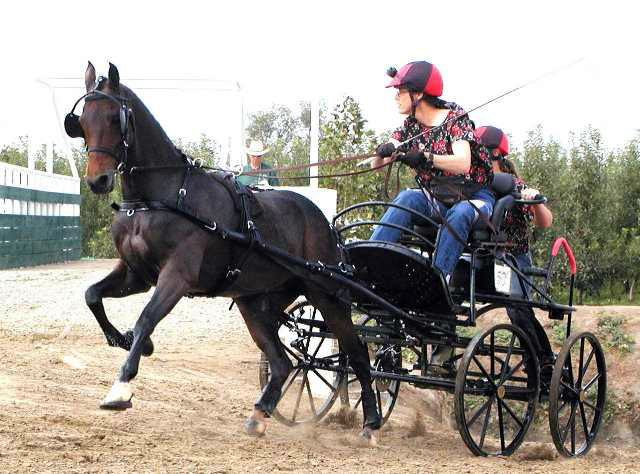 The Dartmoor Merlin is a modern 4-wheel marathon vehicle. Like the Gig, it was made in England, and is light weight while still meeting FEI minimum (250 lbs). It has manual hydraulic disk brakes on the rear, adjustable footrest, and steel wheels with solid rubber tires.